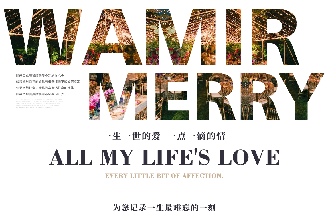 万庆婚礼策划是一家提供专业时尚婚礼服务的机构。万庆拥有专业的婚礼服务团队,并用自己的创意演绎着婚礼的完美与浪漫。收藏幸福,珍藏点滴,万庆相信,所有完美的婚礼都源于最初的真实,让我们共同见证爱的浪漫,见证一生的承诺!让万庆婚礼成为您新生活的开始,让您的爱情如花蔓一样慢慢成长!从此,我们约定从婚姻殿堂出发,一起走向未来的幸福和梦想!